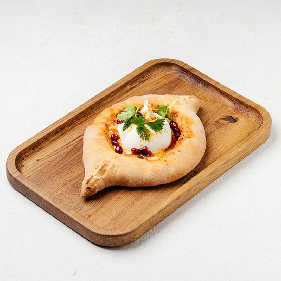 Тесто, начинка сырная, буррата, апельсиновый перец, харисса, зёрна граната