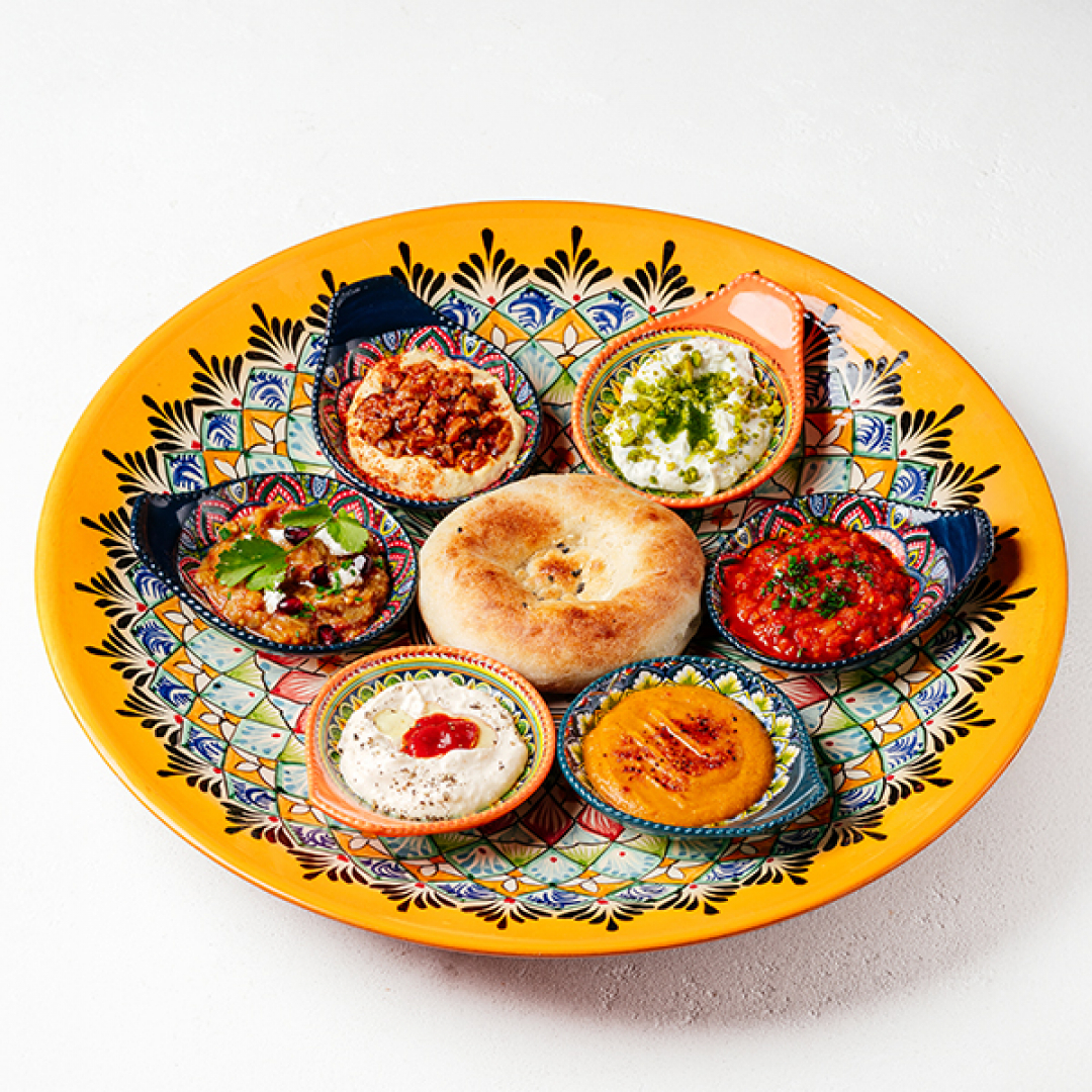 Лабне с фисташками, харисса, баклажан рубленый, фава с кебабом, морковный хумус, луковый лабне, лепёшка из тандыра