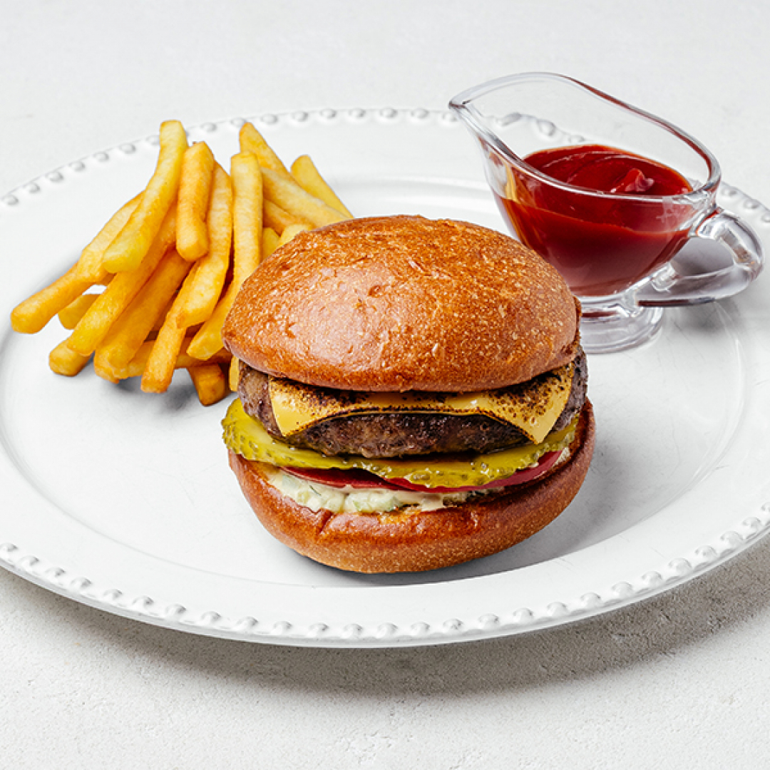 Булочка, котлета из баранины, консервированный огурец, помидор, соус на бургер, сыр чеддер, картофель фри, кетчуп
