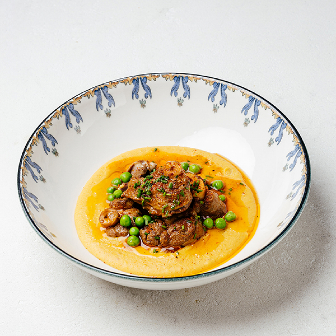 Томлёная баранина, пюре из гороха нут, зелёный горошек, лук-сибулет