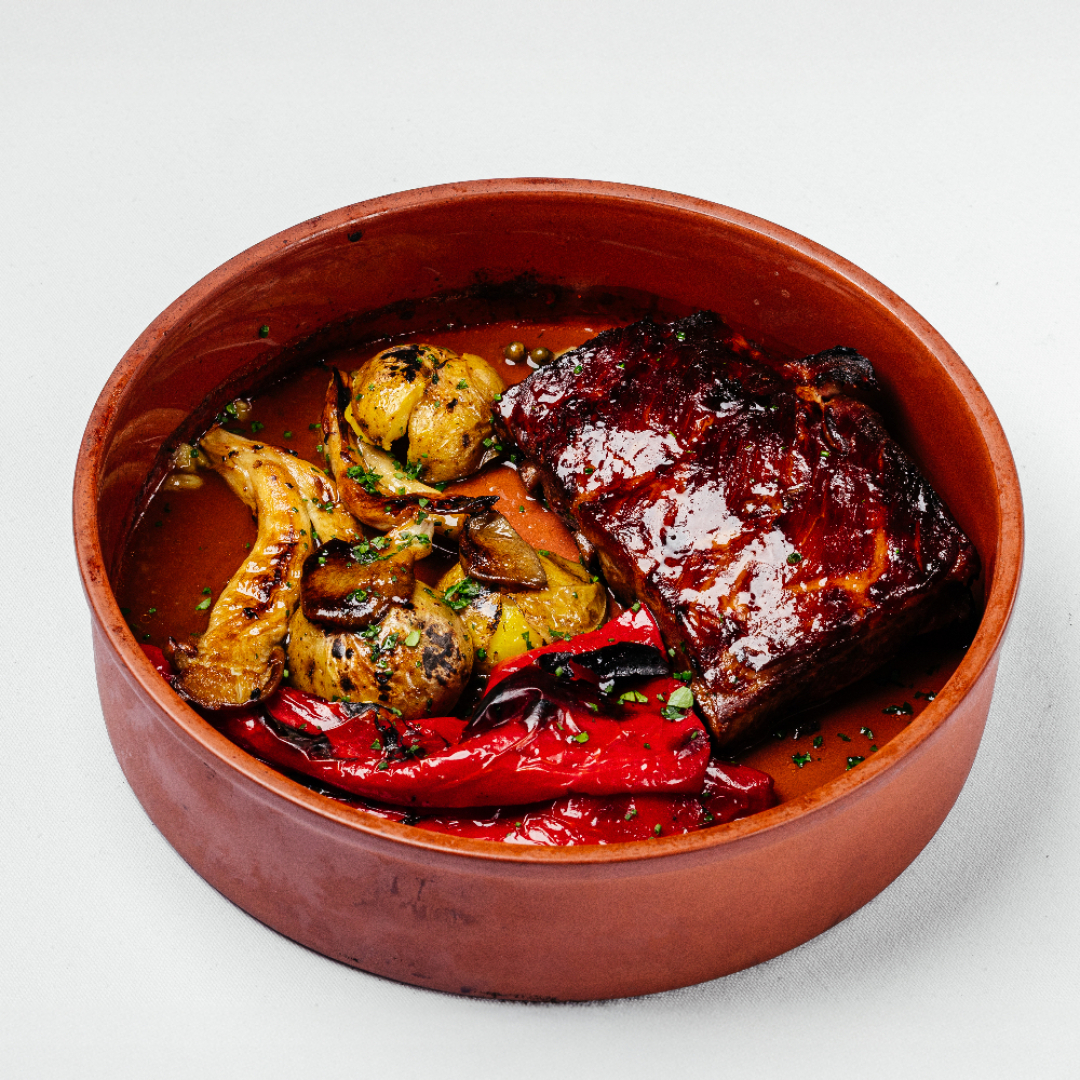 Свиные рёбра, мини-картофель, перец рамиро, бульон куриный, соусм демиглас, чеснок, лук сибулет, гриб вешенка
