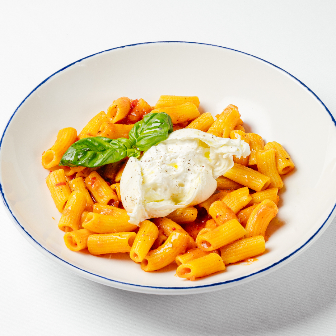 Паста ригатони, репчатый лук, перец чили, куриный бульон, база томатная (лук, чеснок, соль, перец, масло оливковое, томаты в собсвтенном соку), специи, буррата, масло оливковое, базилик