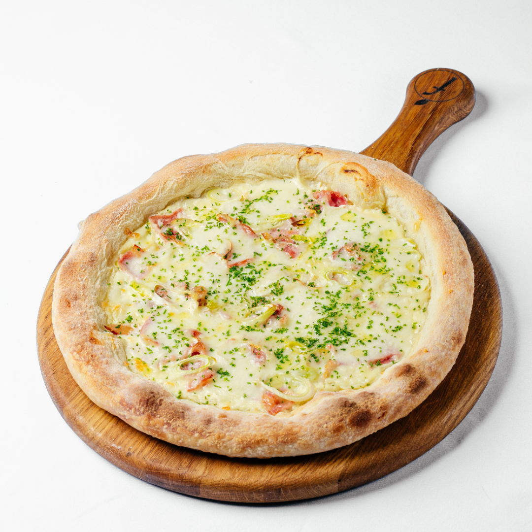 Тесто, сметанный соус, лук порей, бекон, моцарелла, пармезан, лук резанец масло оливковое.