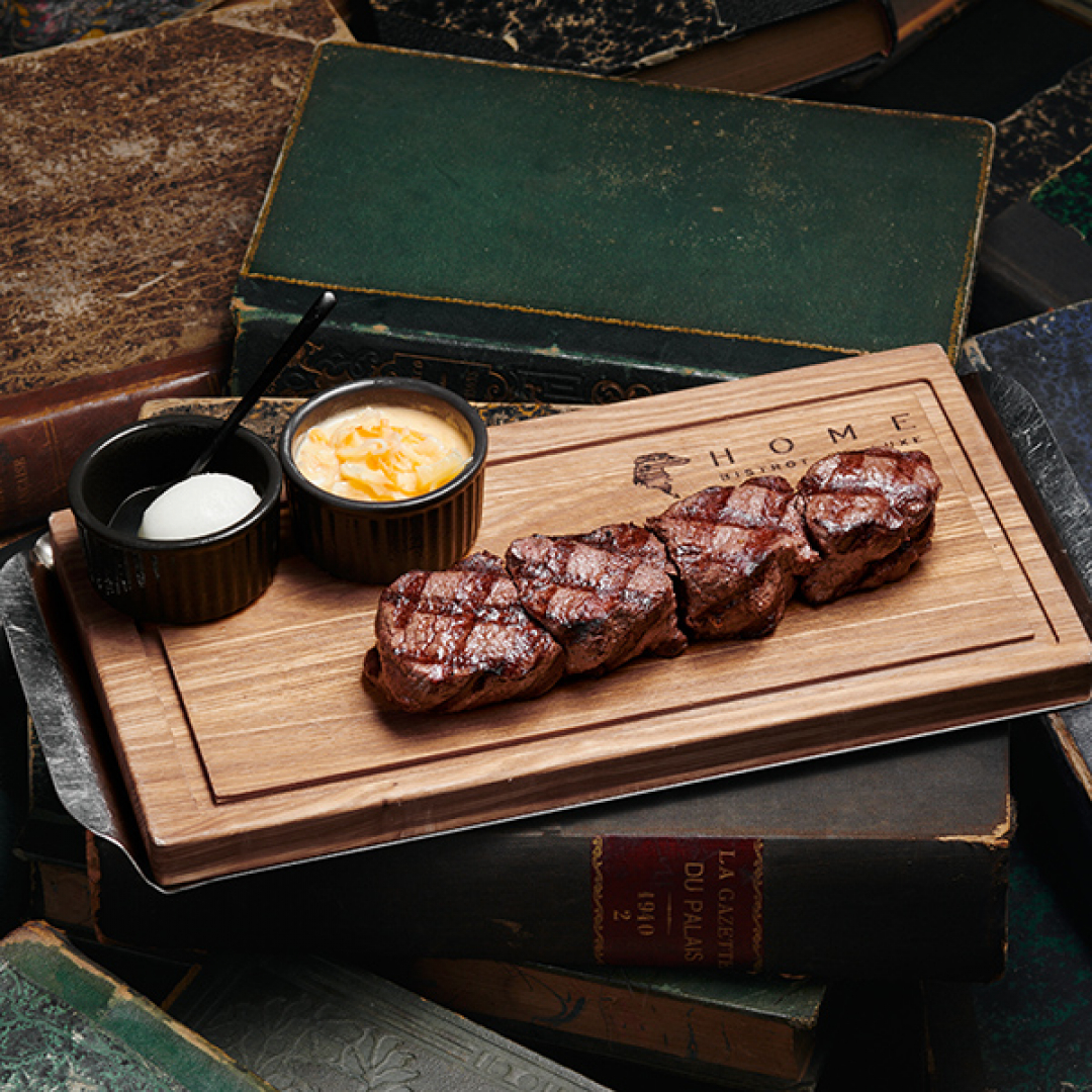 Вырезка мраморной говядины, салат из капусты с ананасом, соусы на выбор