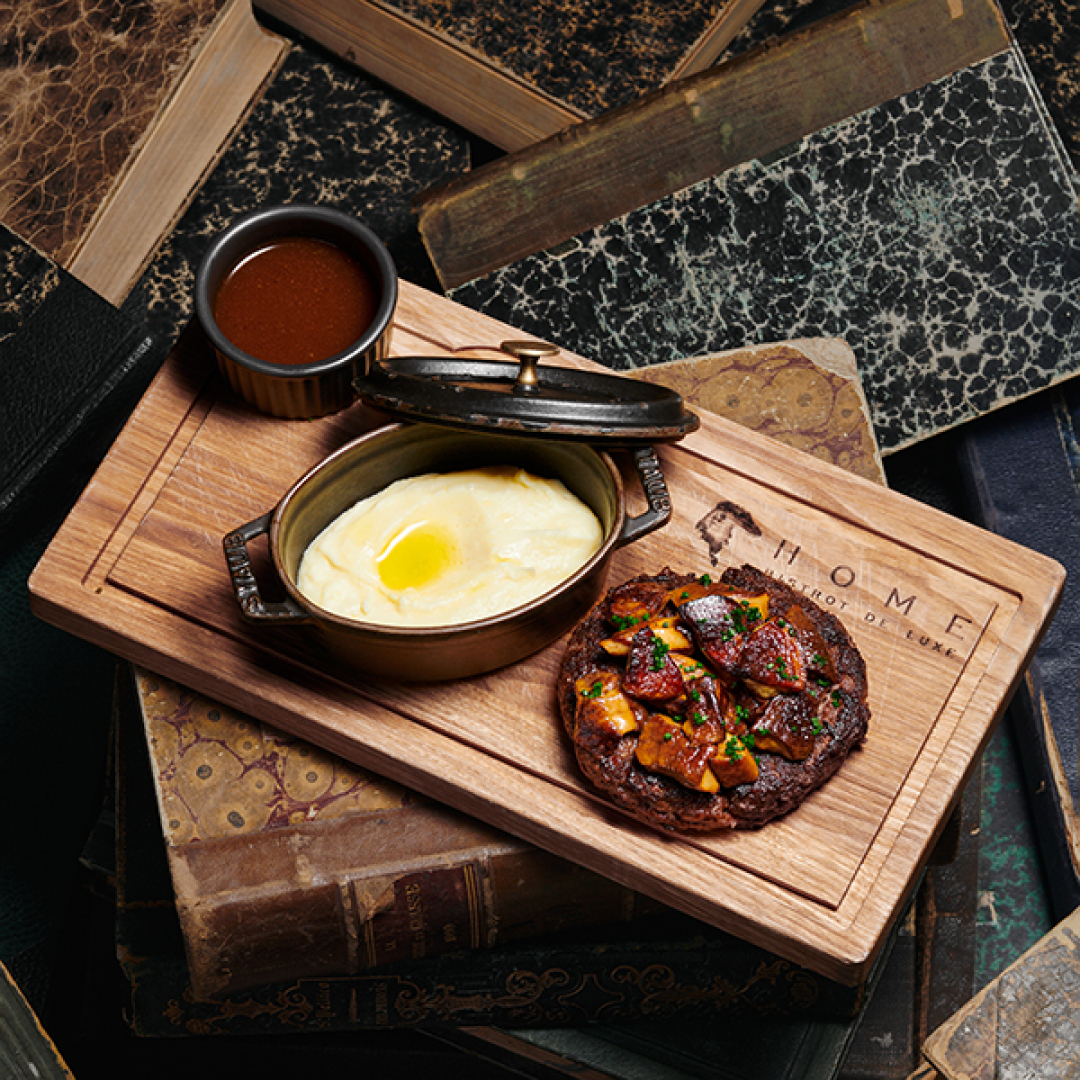 Бифштекс из мраморной говядины, картофельное пюре, жареные грибы, соус демиглас
