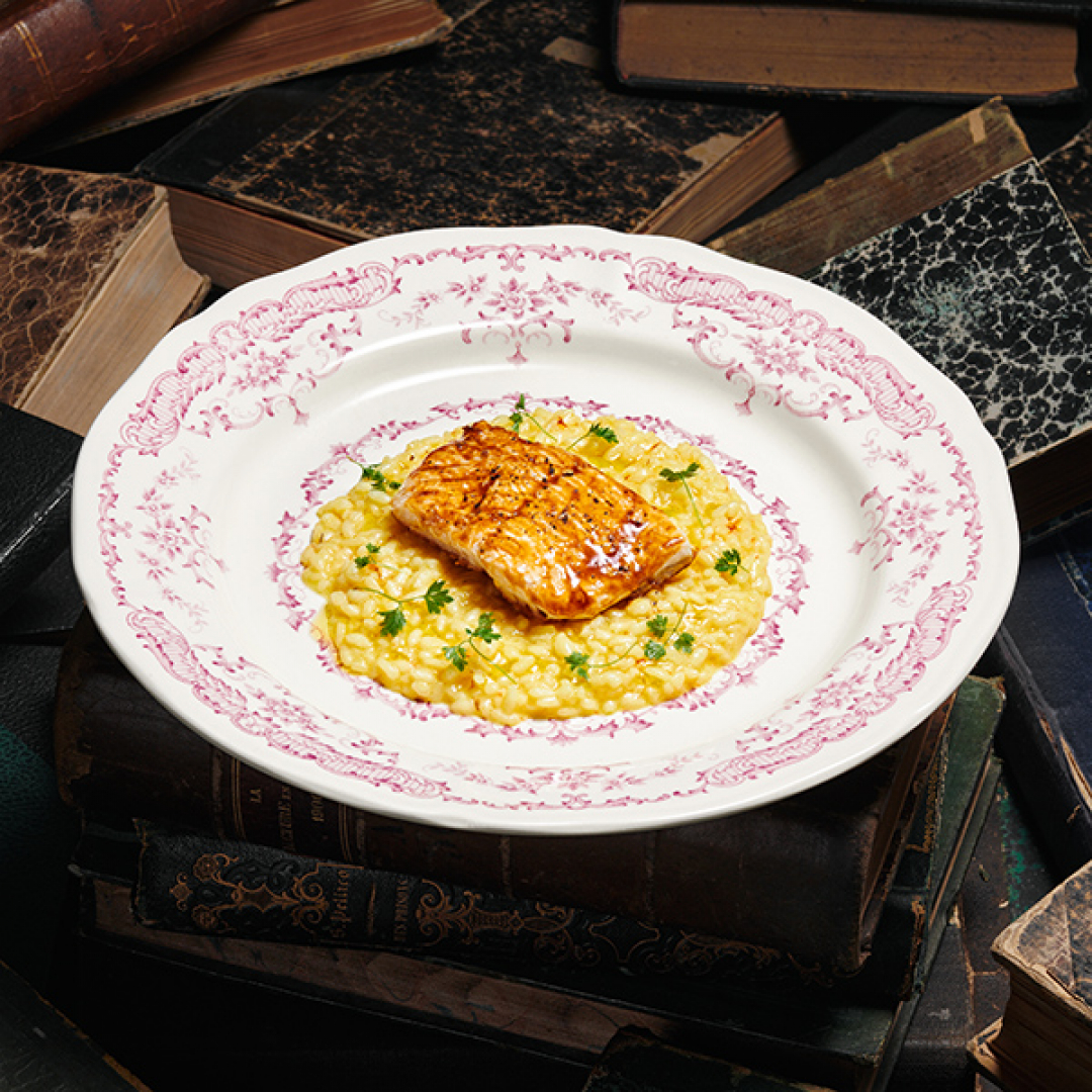 Филе палтуса, сливочное масло, рис ризотто, куриный бульон, репчатый лук, белое вино, сыр пармезан