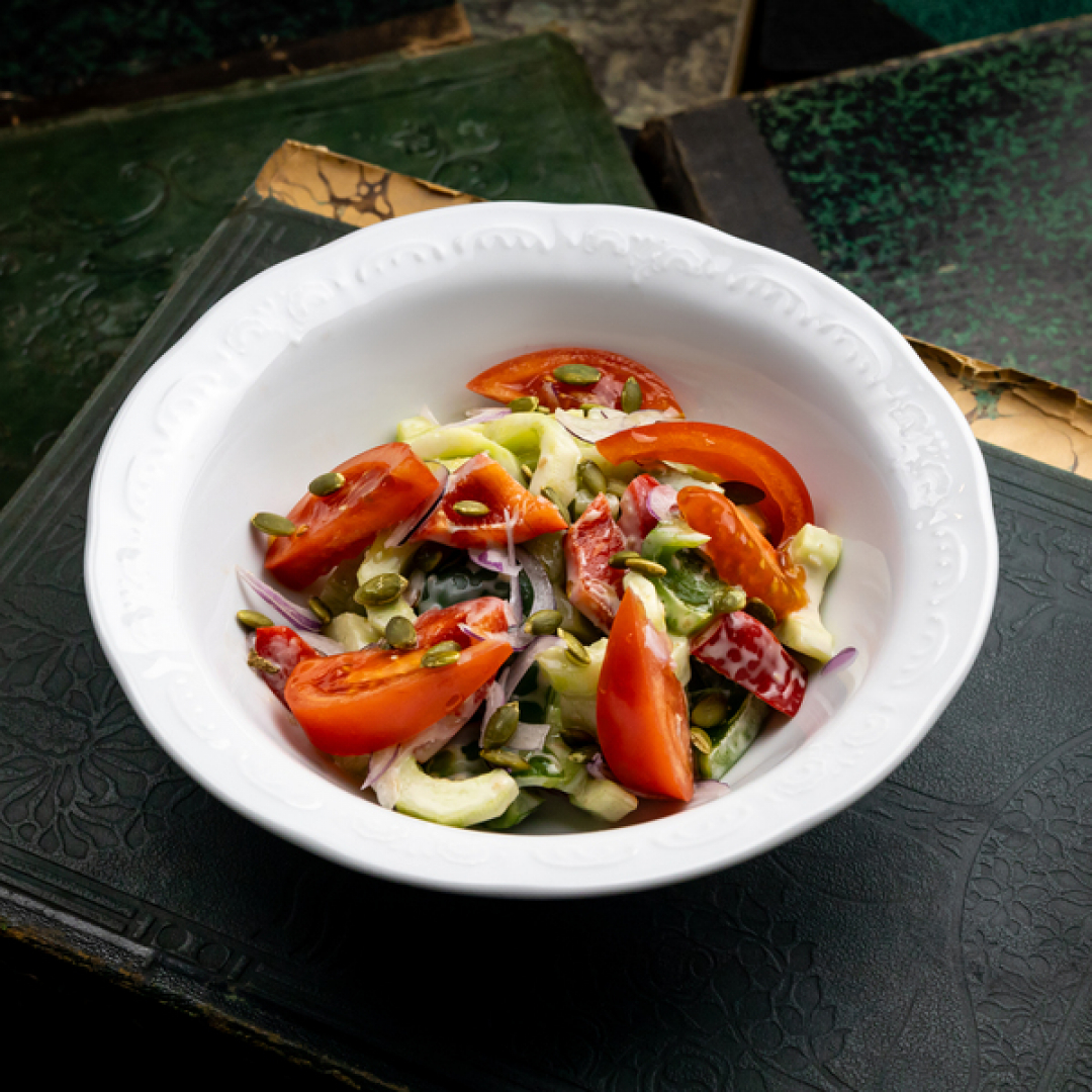 Огурец, томаты розовые, зелёный и красный болгарский перец, ялтинский лук, ореховый соус, тыквенные семечки, масло оливковое extra