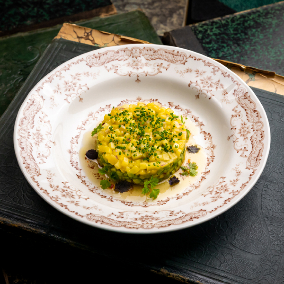Авокадо, манго, ялтинский лук, сок лайма, оливковое масло, соус сладкий чили, лук-резанец