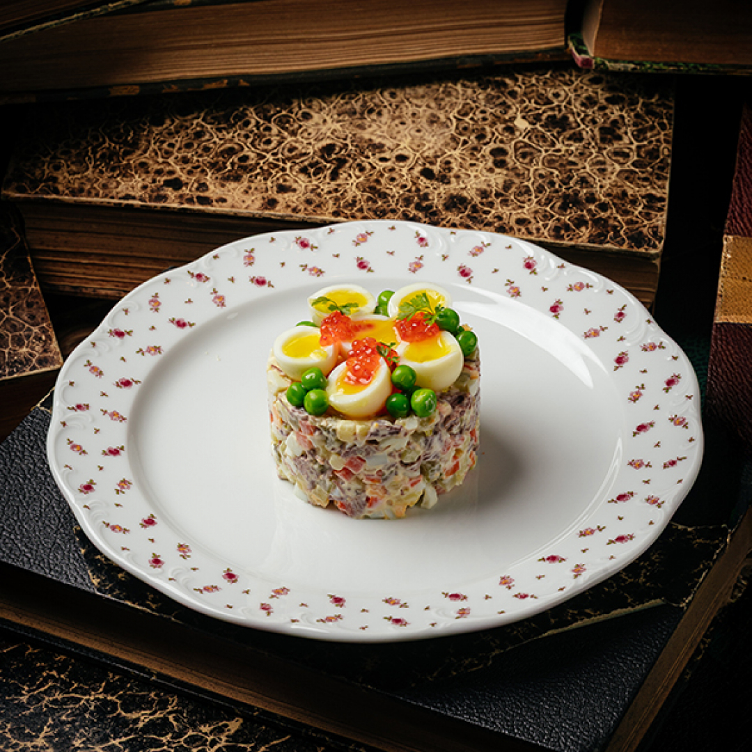 Мраморная говядина, отварные картофель и морковь, куриное и перепелиное яйцо, солёный огурец, красная икра, зелёный горошек, домашний майонез, оливковое масло, горчица, микрозелень