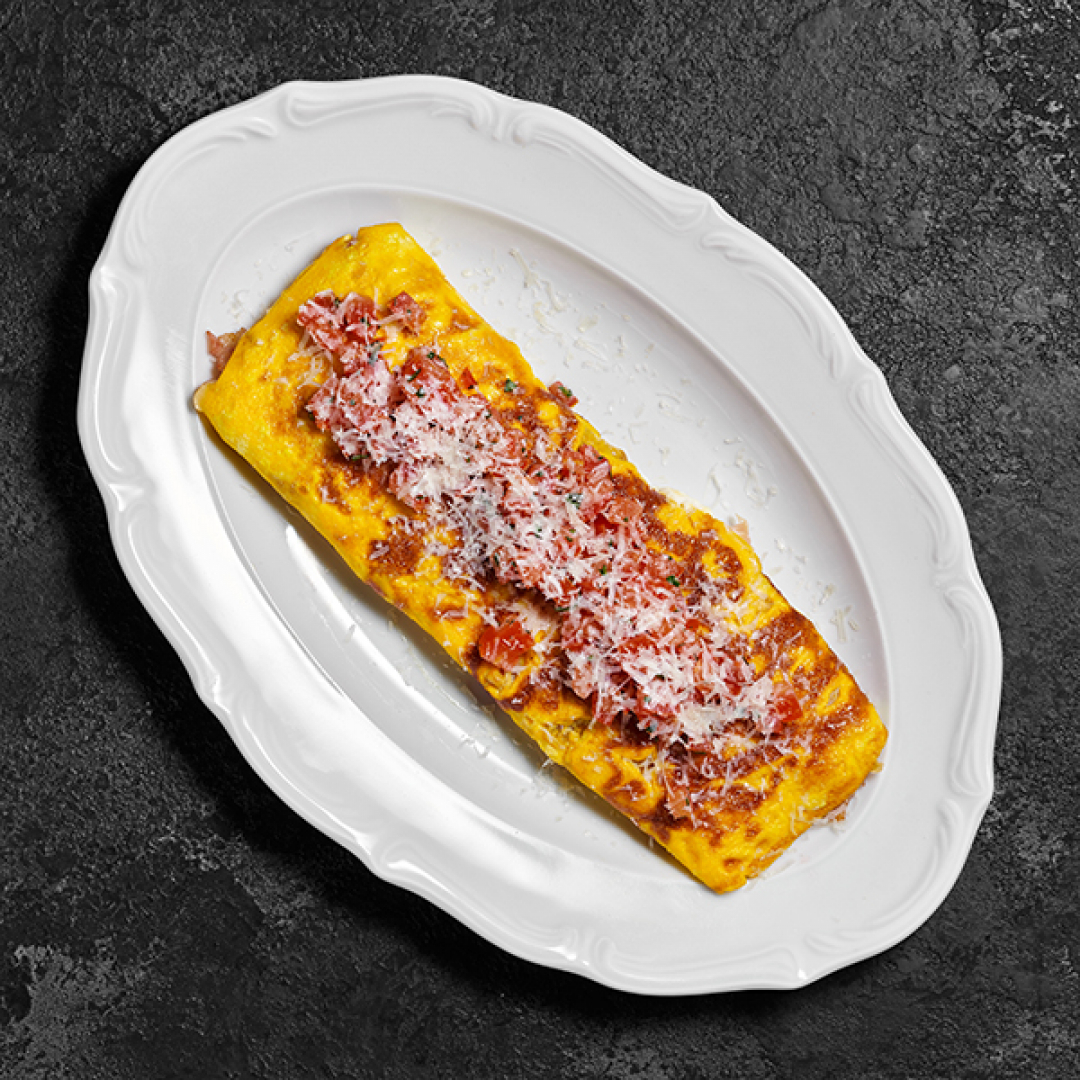 Омлет, трюфельная рикотта, сыр пармезан, помидор розовый,масло трюфельное, зелень (укроп, петрушка)