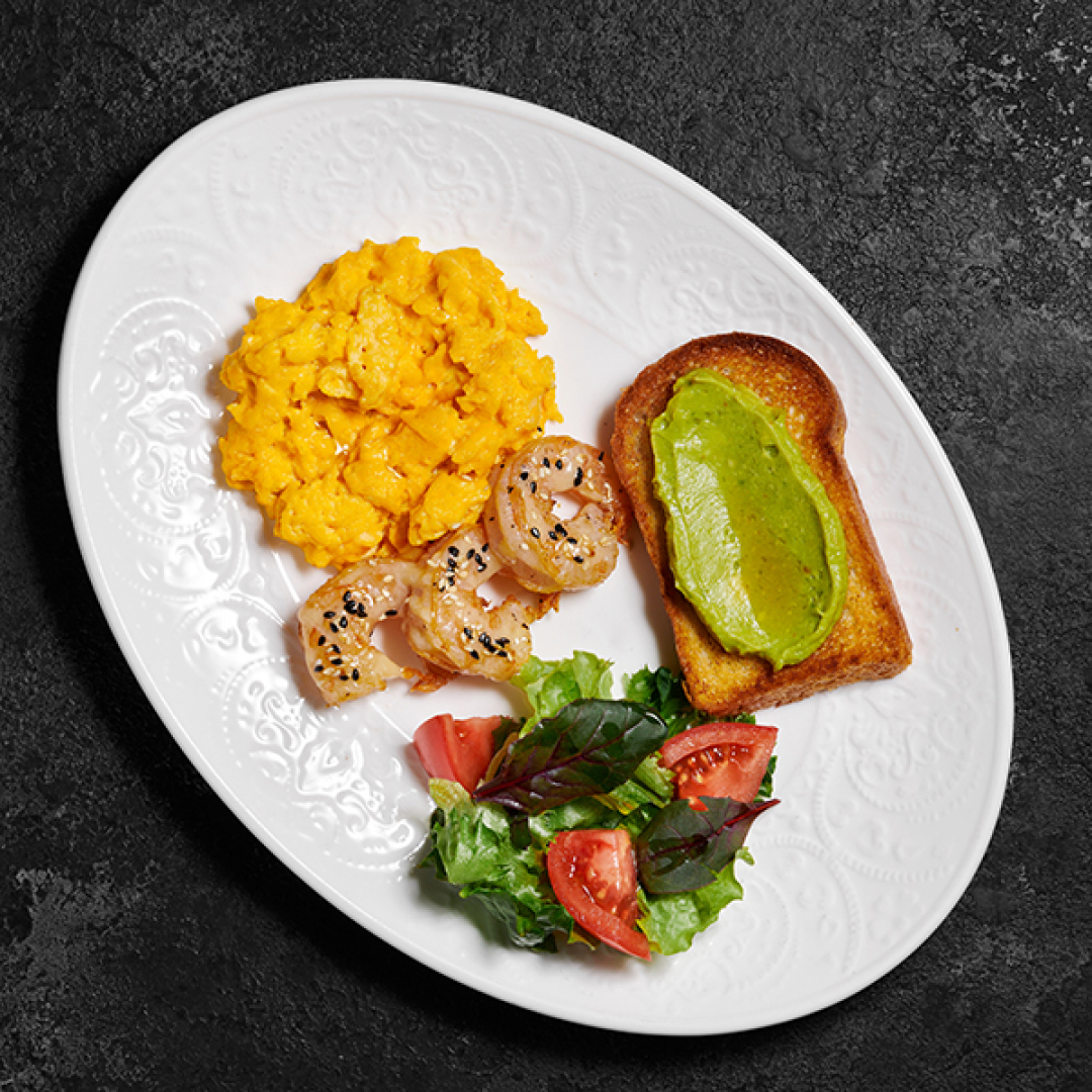 Скрэмбл с креветками, овощами и бриошью с гуакамоле