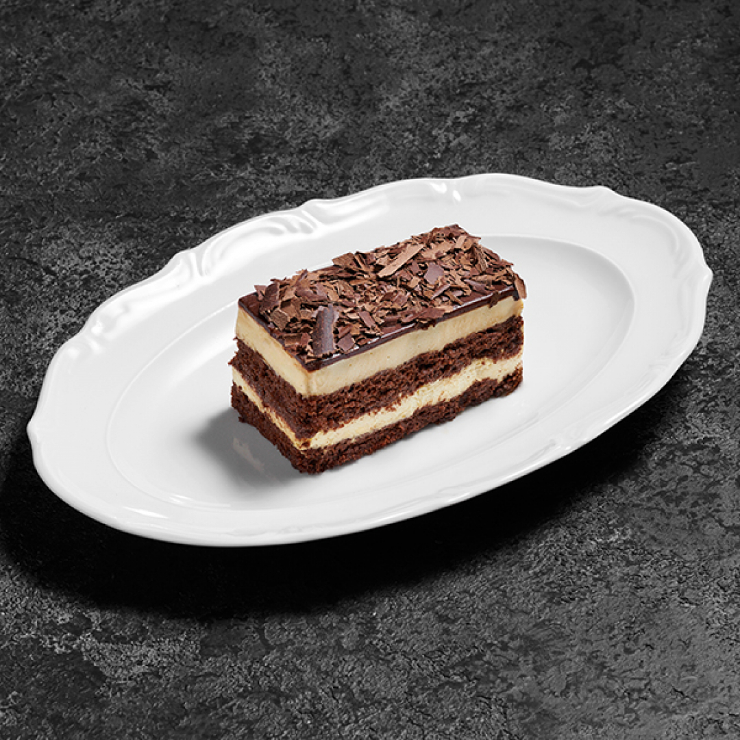 -Кофейный бисквит (мука пшеничная, какао порошок, кофе молотый, пудра сахарная, разрыхлитель, эспрессо, растительное масло, яйцо, сахар) -Мусс карамельный (сахар, сливки 33%, эспрессо, желток, шоколад карамельный, желатин говяжий) -Соленая карамель (сахар, глюкоза, сливки 33%, эспрессо, масло сливочное, соль) -Заварной кофейный крем (эспрессо, сливки 33%, желток, сахар, желатин говяжий) -Шоколадный хруст (вафельная крошка, шоколад темный 52%) -Шоколадная глазурь (какао масло, шоколад темный 52%)
