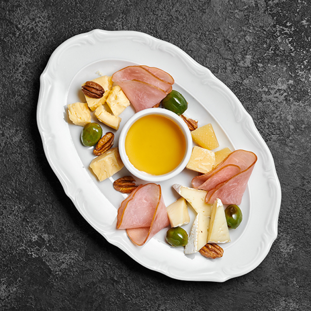 Сыры гауда, пармезан и бри, свиной балык, липовый мёд, оливки, орех пекан