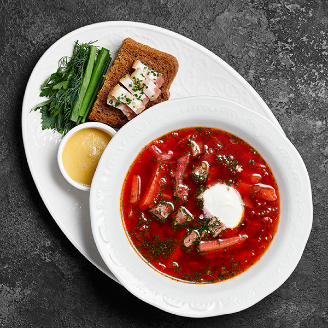 Куриный бульон, говядина толстый край, капуста, картофель, свёкла, репчатый лук, томатная паста, чеснок, солёное свиное сало, сметана, хлеб, укроп, зелёный лук