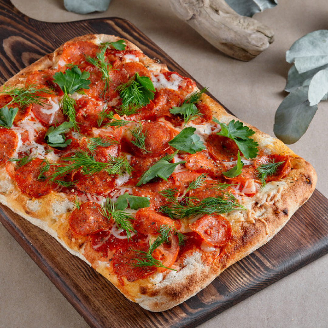 Колбаса пепперони, соус помодоро, сыр моцарелла, прованские травы, зелень