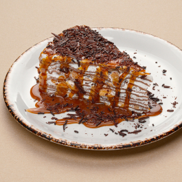 Слои мягкого бисквита с кремом из сметаны со сгущёнкой и сливочным сыром с шоколадным соусом и фисташками, сублимированная малина