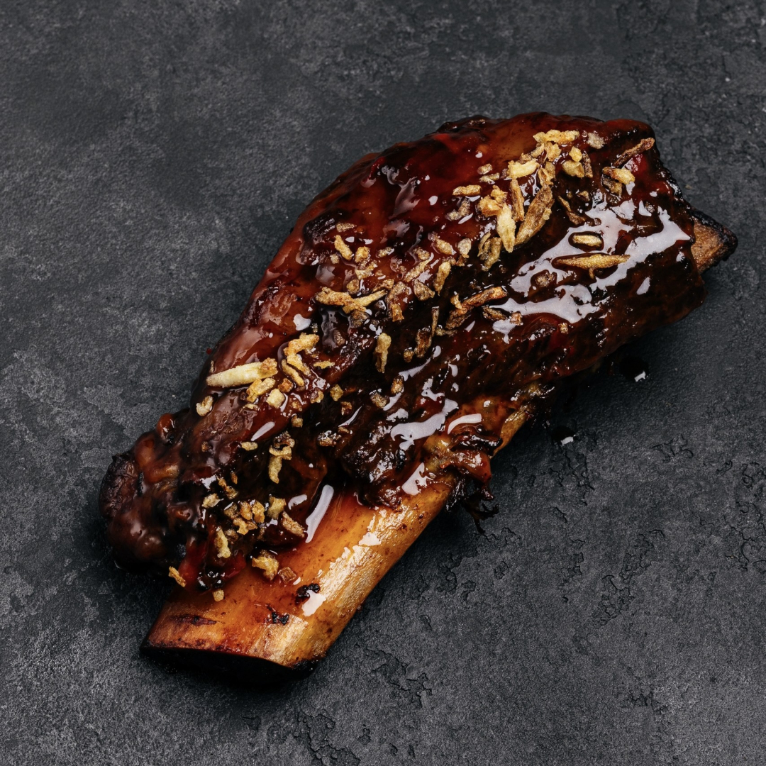 Говяжьи рёбра кальби, мини-картофель, соус мясной терияки, лук фри