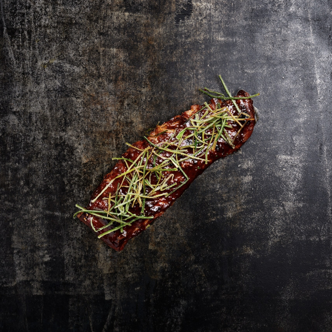 Свиные рёбра су-вид, соевый перечный соус, жареный лук-порей