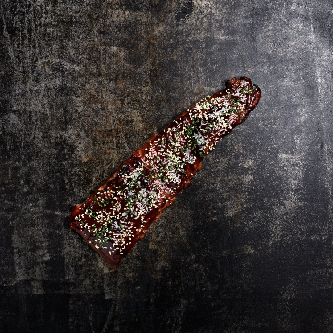 Свиные рёбра су-вид, соус хойсин, лук-резанец, кунжут