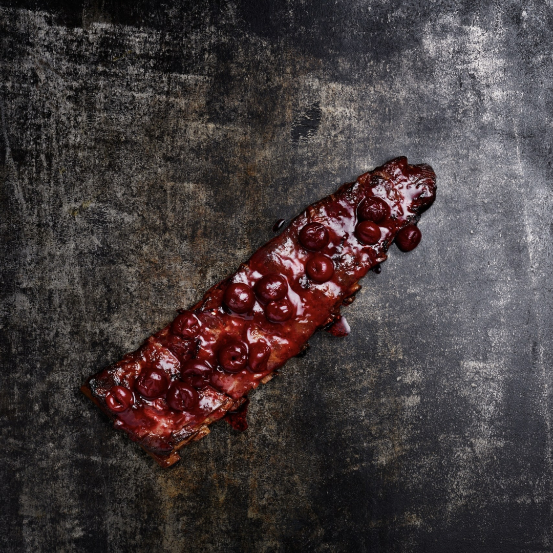 Свиные рёбра су-вид, вишнёвый соус, вишня