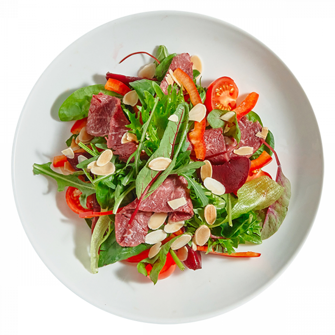 Подкопчённая говядина, томаты черри, болгарский перец, слива, соус сливовый, микс зелени, лепестки арахиса
