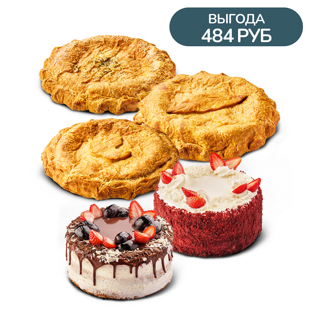 Торт Бананово-клубничный мини, Торт Красный Бархат мини, Курник со шпинатом на слоеном тесте, Пирог картофельно-мясной с грибами на слоеном тесте, Капустник на слоеном тесте.