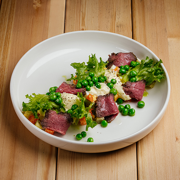 Ростбиф из говядины, отварные морковь и картофель, куриное яйцо, консервированный огурец, зелёный горошек, майонез, микс зелени, зелёное масло.