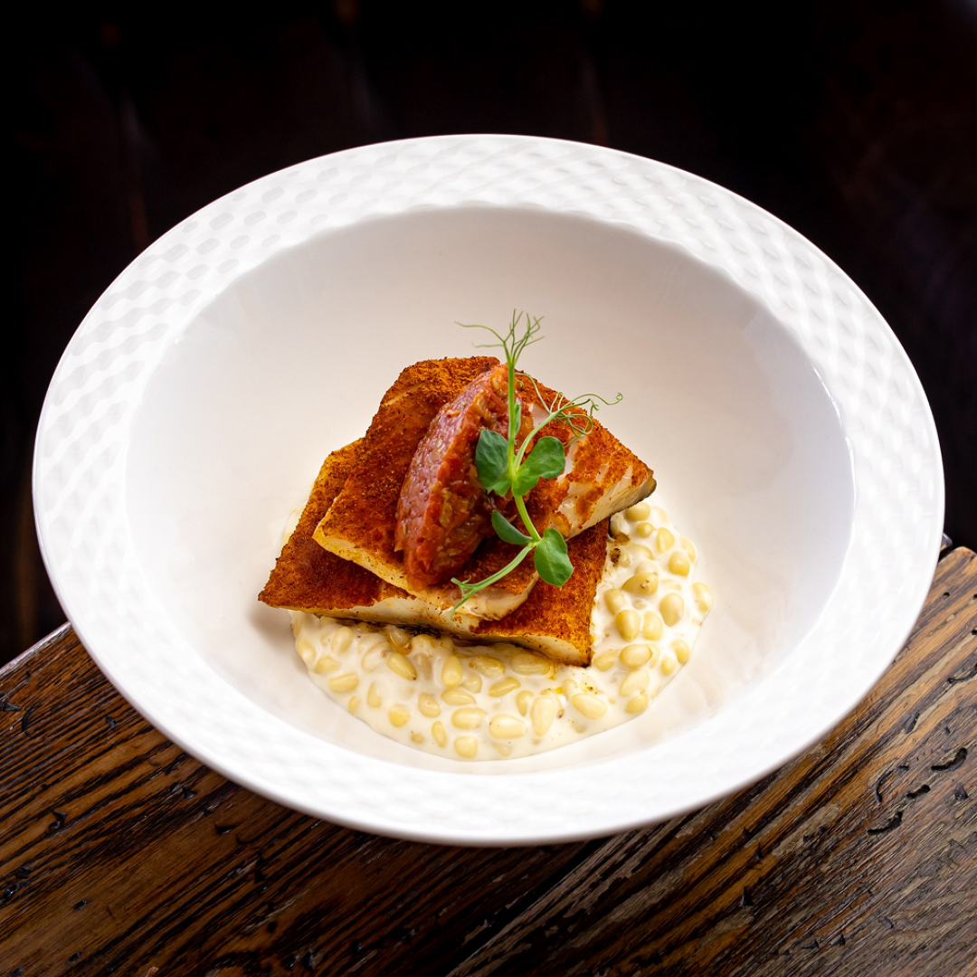 Нежное филе муксуна мы панируем в крошке из подсушеных оливок, вяленых томатов и тимьяна. Изюминка этого блюда – каша из кедрового ореха