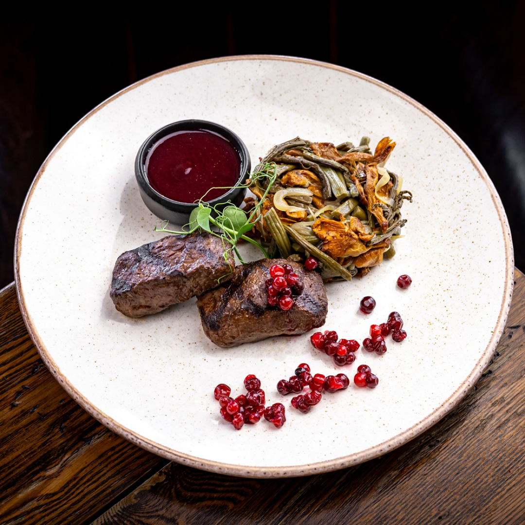 Оленина, розмарин, фирменный маринад, брусничный соус (брусника, сахар, вино), брусника моченая, папоротник, чеснок, лук репчатый, лисички или вешенки
