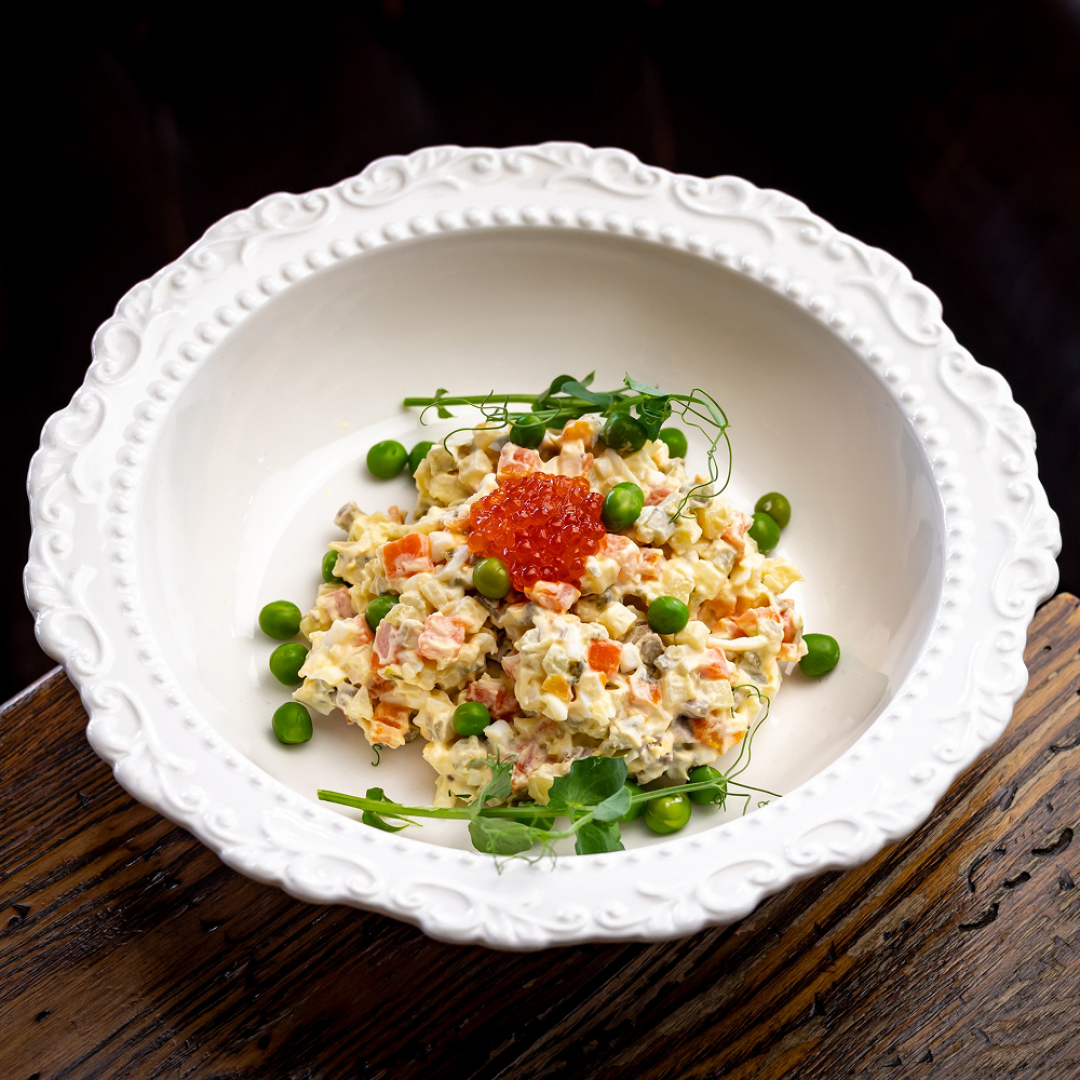 Авторская версия классического Оливье: с говяжьим языком и копченой утиной грудкой