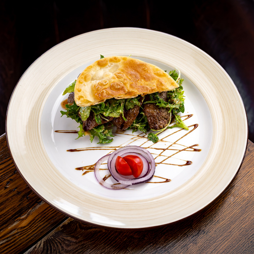Салат из нежной телятины, томатов черри, салатного микса с якуской лепешкой и пикантной заправкой