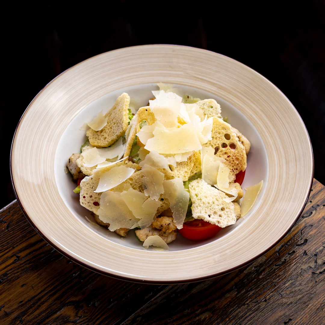 Свежеобжаренная куриная грудка, томаты черри, пармезан, фирменная заправка
