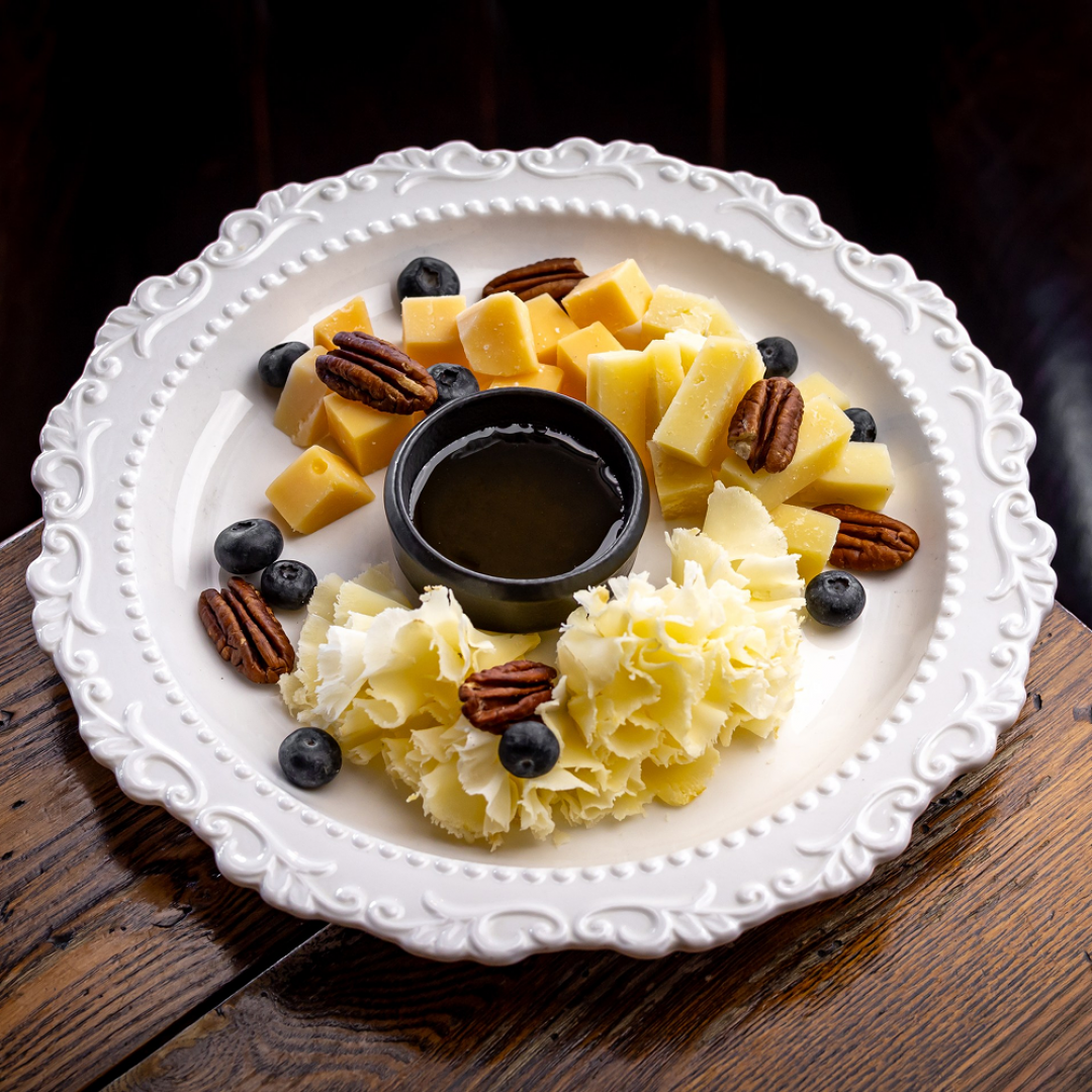 Бри, Дор Блю, Пармезан, Качотта сливочная, орех «Пекан», мед, виноград, клубника, мята, физалис, печенье