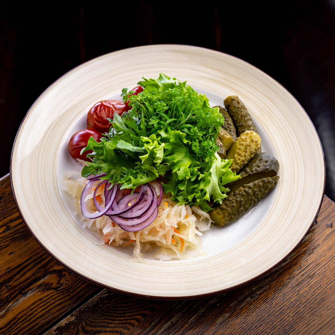 Соленые помидоры, огурцы, патиссоны, капуста квашеная, репчатый лук, микс зелени