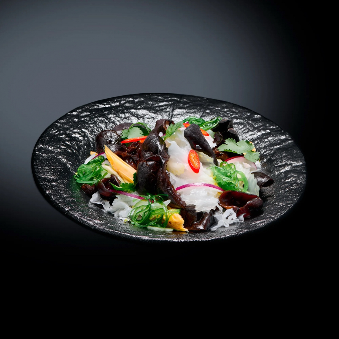 Древесный гриб, соевая спаржа, водоросли чука, сельдерей, красный лук, перец чили, соус: оливковое масло, кунжутное масло, уксус, соус сладкий чили, сахар, соль.