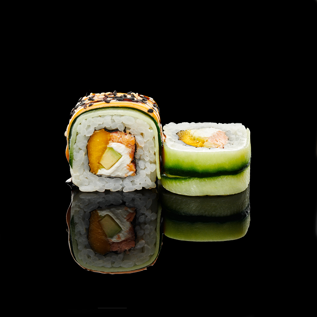 Водоросли нори, рис, креветка темпура, огурец свежий, сыр творожный, соус сырно-лимонныйс, кунжут, соус унаги, соус азиатский, икра масаго